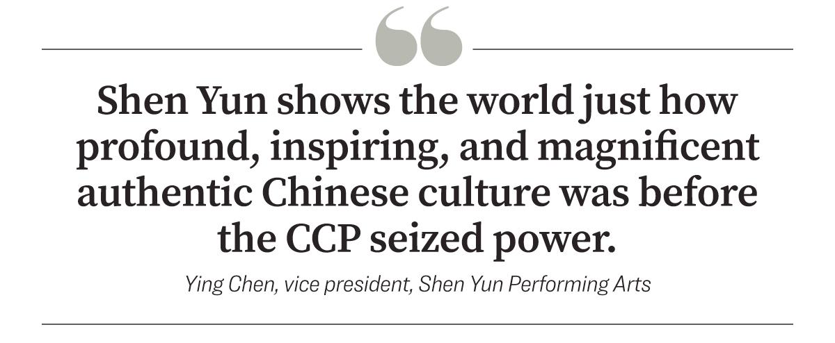 “Shen Yun shows the world just how profound, inspiring, and magnificent authentic Chinese culture was before the CCP seized power, while also offering a captivating vision for how wonderful China could be once again without the CCP,” said Ying Chen, a vice president with Shen Yun Performing Arts.