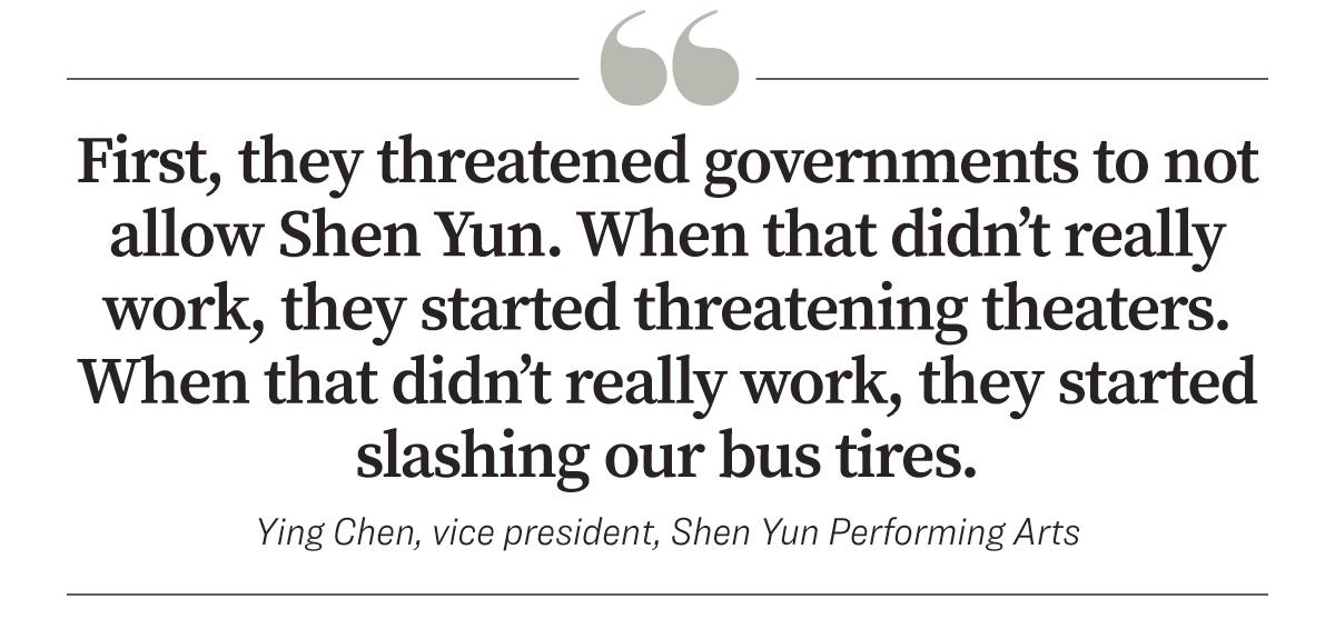“First, they threatened governments to not allow Shen Yun. When that didn’t really work, they started threatening theaters. When that didn’t really work, they started slashing our bus tires,” Ms. Chen said.